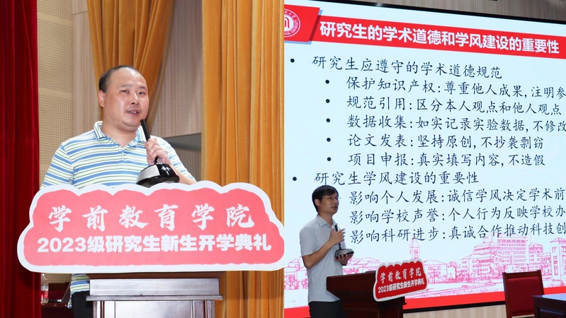 開學(xué)典禮儀式之后,學(xué)院進(jìn)行2023級研究生新生入學(xué)教育。學(xué)院教務(wù)老師錢佳宇老師以每一學(xué)期的核心任務(wù)為出發(fā)點(diǎn),分別對二年制專碩和三年制學(xué)碩、博士的培養(yǎng)過程和管理辦法進(jìn)行詳細(xì)介紹。隨后,魏威老師為同學(xué)們帶來學(xué)術(shù)道德與學(xué)風(fēng)建設(shè)教育宣講,他指出,研究生階段應(yīng)不斷培養(yǎng)自己的學(xué)術(shù)興趣和學(xué)術(shù)能力,嚴(yán)格遵守學(xué)術(shù)規(guī)范和科學(xué)道德。同時(shí),魏老師指出,同學(xué)們在做研究時(shí)一定要保護(hù)好幼兒的隱私,守護(hù)幼兒身心健康,嚴(yán)守科研倫理。