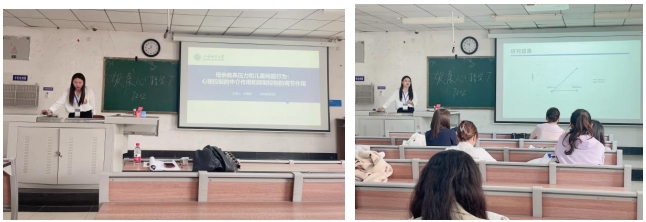 孫娟娟在“發(fā)展心理學專業(yè)委員會”分場以口頭報告的形式展示了她的研究成果《母親教養(yǎng)壓力和學前兒童問題行為:心理控制的中介作用和抑制控制的調(diào)節(jié)作用》。她的報告邏輯清晰,生動有趣,獲得了現(xiàn)場其他參會者的高度肯定和贊賞。