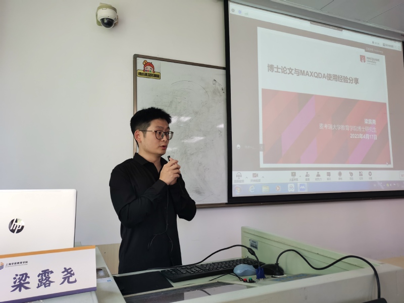 沙龍活動開始后,博士生梁露堯首先進(jìn)行了自我介紹,并簡要介紹了自己的博士論文。他詳細(xì)闡述了論文的標(biāo)題、研究背景、研究意義、研究問題、論文結(jié)構(gòu)及論文中的四個子研究等內(nèi)容,同時分享了MAXQDA這一質(zhì)性分析軟件的使用經(jīng)驗(yàn)。他指出,MAXQDA具有用戶友好、易上手、多系統(tǒng)同步等特點(diǎn),并實(shí)際演示了該軟件的基本操作,介紹了菜單欄與界面上四個窗格的作用,強(qiáng)調(diào)了代碼備忘錄、代碼本、可視化工具等功能的重要性。