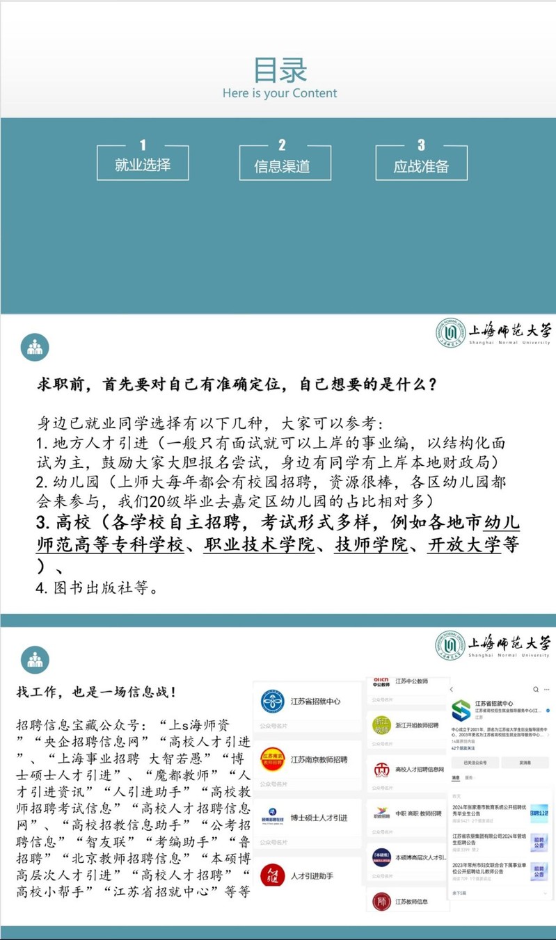 張夢琴為2022屆學(xué)前教育專業(yè)研究生,現(xiàn)就職于南京特殊教育師范學(xué)院,擔(dān)任專任教師崗位。此次分享她從就業(yè)選擇、信息渠道、應(yīng)戰(zhàn)準(zhǔn)備三個(gè)方面分享高校就業(yè)心得。張夢琴認(rèn)為,求職最關(guān)鍵的是對自身有準(zhǔn)確定位,明確所追求的就業(yè)方向。其次,“就業(yè)也是一場信息戰(zhàn)”,招聘信息瞬息萬變,同學(xué)們可以充分利用微信公眾號、小紅書、地方網(wǎng)站等平臺(tái)搜索招聘信息,與同學(xué)互相分享就業(yè)信息,并積極向心儀招聘崗位投簡歷。最后,夢琴學(xué)姐從筆試和面試兩個(gè)方面詳細(xì)介紹了高校求職準(zhǔn)備,提及不同院校的筆試考試風(fēng)格都有所不同,面試則多采用試講的形式。