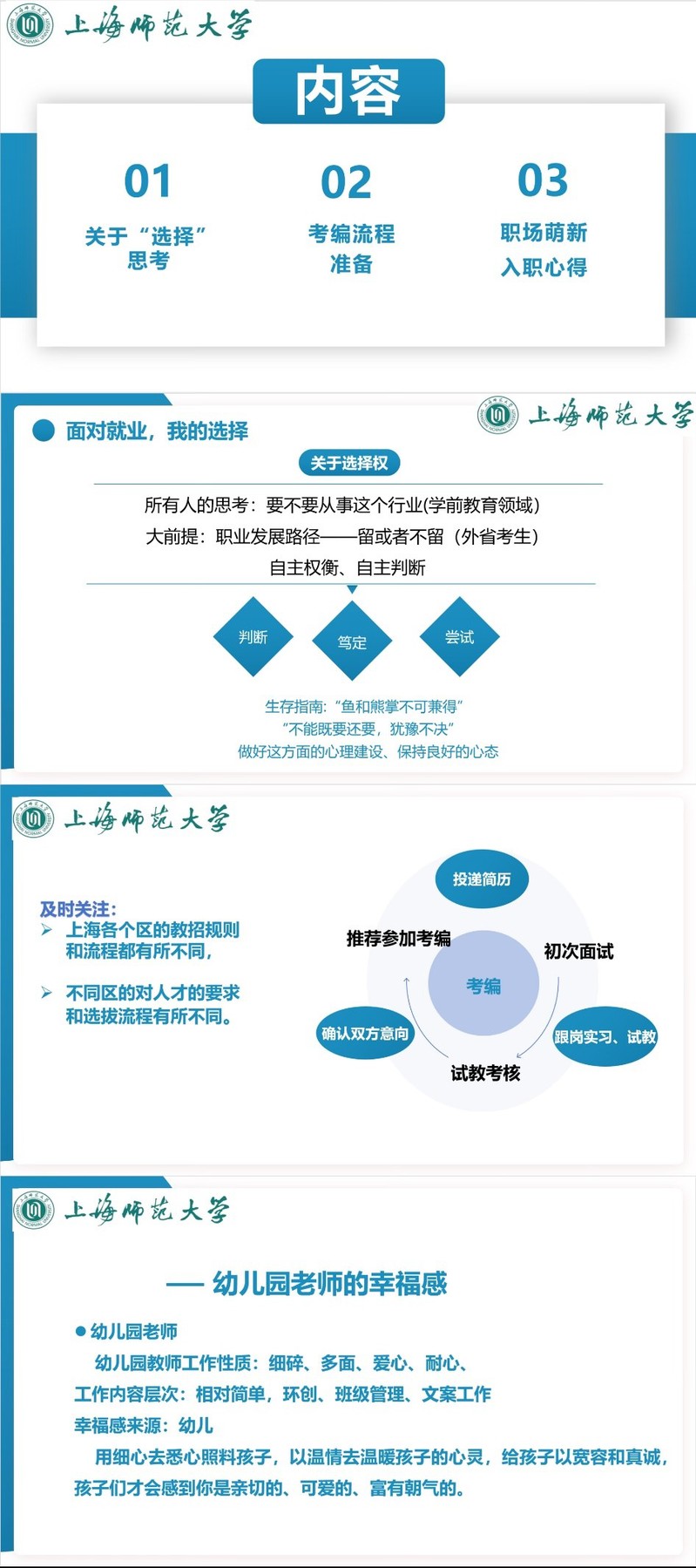 梁小敏同樣為2022屆學(xué)前教育專業(yè)研究生,現(xiàn)就職于上海市黃浦區(qū)荷花池幼兒園,擔(dān)任幼兒園教師。此次講座她從就業(yè)選擇、考編流程、入職心得三個(gè)方面分享上海幼兒園教師考編就業(yè)心得。她認(rèn)為,在就業(yè)選擇方面“不能既要還要,猶豫不決”,應(yīng)該以積極嘗試的態(tài)度來探索自己心儀的就業(yè)方向,并篤定自己的選擇。上海各區(qū)的教師招聘要求和選拔流程都有所不同,應(yīng)及時(shí)關(guān)注、積極關(guān)注,做好充分的準(zhǔn)備。她就黃浦區(qū)的考編流程作了詳細(xì)介紹:筆試包括教師職業(yè)素質(zhì)測評和卡特爾人格測試,面試的流程為設(shè)計(jì)教案、模擬課堂、結(jié)構(gòu)化問答和才藝展示。此外,她談到,在幼兒園的跟崗實(shí)習(xí)、試教都非常重要,可以促進(jìn)幼兒園與求職者雙方的意向。最后,她鼓勵(lì)同學(xué)們要勇于嘗試,敢于迎接各種挑戰(zhàn),并調(diào)適好自己的心理,感受作為幼兒園教師的幸福。