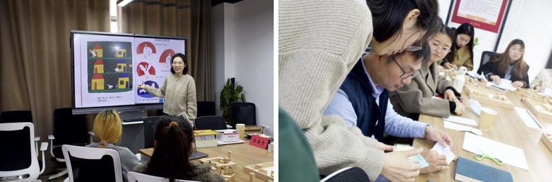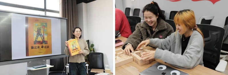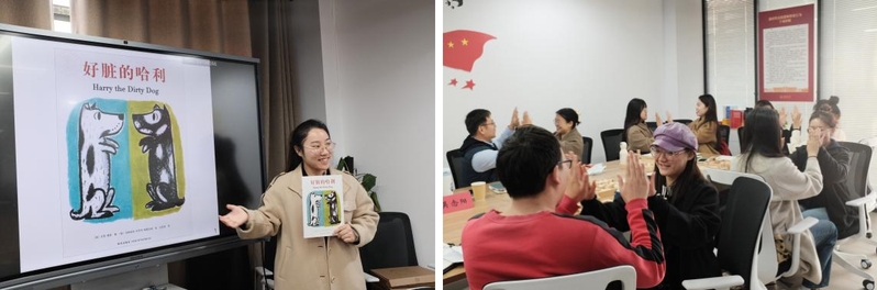 來自“大帶小”團(tuán)隊(duì)的心理學(xué)院周芷怡、尚海青分別帶領(lǐng)志愿者們學(xué)習(xí)了繪本《搬過來搬過去》《公雞的新鄰居》以及《好臟的哈利》,她們抑揚(yáng)頓挫,聲情并茂地展示了繪本帶讀,和志愿者們一起開展了繪本故事的延伸實(shí)踐活動,比如搭積木、制作翻翻書、哈利操等,通過趣味活動幫助幼兒提高敘事能力、動手能力以及空間認(rèn)知和想象力。