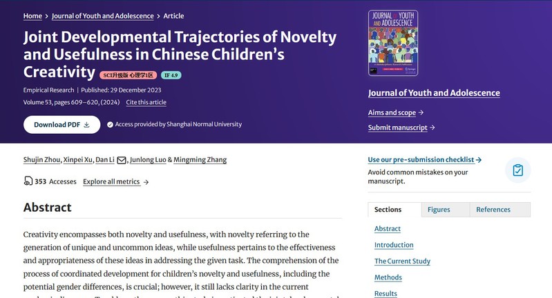 我院師資博士后周淑金老師在JOURNAL OF YOUTH AND ADOLESCENCE期刊的2024年第53卷上發(fā)表研究論文“Joint Developmental Trajectories of Novelty and Usefulness in Chinese Children’s Creativity”。該研究從小學(xué)兒童創(chuàng)造力“四年級下降”現(xiàn)象出發(fā),聚焦于創(chuàng)造力的新穎性與適用性兩個(gè)指標(biāo),采用平行潛在類別增長模型探究兒童創(chuàng)造力的發(fā)展軌跡。研究結(jié)果表明兒童創(chuàng)造力的發(fā)展受到包括新穎性和實(shí)用性在內(nèi)的多方面模式的影響。此外,在中國兒童創(chuàng)造力發(fā)展的背景下,研究并討論了軌跡群體成員的性別差異。該研究獲得上海市哲學(xué)社會科學(xué)基金的支持。JOURNAL OF YOUTH AND ADOLESCENCE期刊位于中國科學(xué)院文獻(xiàn)情報(bào)中心期刊分區(qū)心理學(xué)大類的一區(qū),SSCI數(shù)據(jù)庫心理學(xué)學(xué)科的一區(qū)。