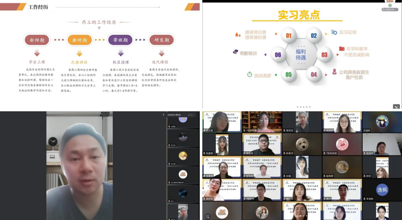 此外,學(xué)院還依托“申幼逐夢”生涯發(fā)展工作室開展了暑期職業(yè)訓(xùn)練營系列講座。7月14日邀請就職于昂立青少兒成長中心的校友肖為溪分享自己從新師期、教研期、帶班期到研發(fā)期四個階段的職場成長與心路歷程,邀請昂立教育校招經(jīng)理童卓遠(yuǎn)從建校經(jīng)歷、文化活動、現(xiàn)有業(yè)務(wù)、實習(xí)崗位等板塊詳細(xì)介紹有關(guān)情況。周澤龍就昂立教育對開展訓(xùn)練營活動的支持表示感謝,并鼓勵同學(xué)們積極投身職業(yè)體驗,在親身實踐中加深對教培機(jī)構(gòu)等行業(yè)的有關(guān)了解,拓寬就業(yè)視野,明晰擇業(yè)規(guī)劃,提升就業(yè)勝任力。