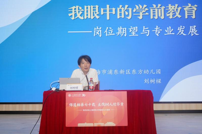 上海市特級(jí)教師、東方幼兒園課程部主任劉樹(shù)樑帶來(lái)了“我眼中的學(xué)前教育——崗位期望與專業(yè)”的專題講座。他用生動(dòng)有趣的案例向同學(xué)們展示了學(xué)前教育教師需要具備的崗位素養(yǎng)和職業(yè)要求。他強(qiáng)調(diào)了“認(rèn)識(shí)孩子”的重要性,提醒未來(lái)的學(xué)前教師們要細(xì)心觀察每一個(gè)孩子,了解他們的個(gè)性、興趣和需求。只有真正認(rèn)識(shí)孩子,才能更好地回應(yīng)他們的成長(zhǎng)需求,為他們提供個(gè)性化的教育支持。劉樹(shù)樑還與大家探討了“認(rèn)識(shí)教育”的內(nèi)涵。他指出,教育是一個(gè)不斷發(fā)展的過(guò)程,學(xué)前教師需要具備扎實(shí)的專業(yè)知識(shí)和豐富的教育經(jīng)驗(yàn),保持敏銳的洞察力和創(chuàng)新精神,不斷探索新的教育方法和手段,用科學(xué)的方法引導(dǎo)孩子們健康成長(zhǎng)。