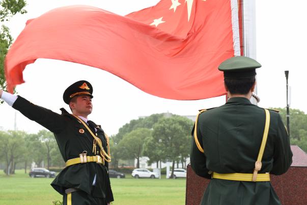 在激昂的國歌聲中,五星紅旗在熠熠晨光中冉冉升起,全體師生肅立注目,表達著對祖國的崇高敬意與深切熱愛。