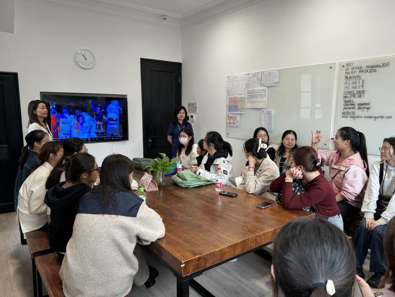 隨后,同學(xué)們分成三組,由幼兒園中、英、法三位教學(xué)主管帶隊參觀幼兒園各年級教室、手工室、烘焙室、閱讀室、戶外空間等各個活動區(qū)域,通過各類教學(xué)實踐活動對瑪諾利婭幼兒園的“6H”辦學(xué)理念有了更深入的了解,并真實地感受到了瑪諾利婭幼兒園溫馨的工作環(huán)境和活躍的課堂氛圍。