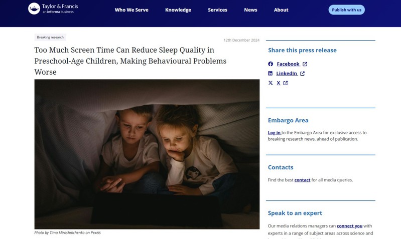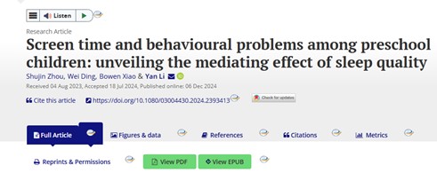 近日,由學(xué)院李燕教授領(lǐng)銜的研究團(tuán)隊(duì),在國(guó)際知名期刊《Early Child Development and Care》發(fā)表了最新研究成果。該成果還作為新聞稿發(fā)布于Taylor & Francis Group新聞室(https://newsroom.taylorandfrancisgroup.com/too-much-screen-time-can-reduce-sleep-quality-in-preschool-age-children-making-behavioural-problems-worse/),Taylor & Francis Group新聞室是一個(gè)在全球范圍內(nèi)具有重要影響力的學(xué)術(shù)傳播平臺(tái),以其豐富的學(xué)術(shù)資源、數(shù)字化出版和對(duì)學(xué)術(shù)可持續(xù)發(fā)展的貢獻(xiàn)而受到高度評(píng)價(jià)。這項(xiàng)研究不僅揭示了屏幕時(shí)間與學(xué)齡前兒童睡眠質(zhì)量及行為問(wèn)題之間的密切聯(lián)系,更突顯了我院學(xué)者在兒童早期發(fā)展領(lǐng)域的學(xué)術(shù)影響力和國(guó)際認(rèn)可度。