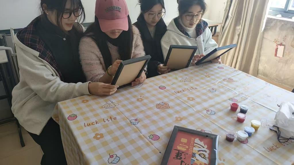 隨后,活動進入了手工實操環(huán)節(jié),學生以“愛國”為主題,在助教的指導下調配紙漿、調制色彩、構圖粘貼,將醒獅文化、紅色符號等元素融入非遺創(chuàng)作,親自制作了不同樣式的紙漿畫?;顒迂撠熑吮硎荆骸凹垵{畫兼具藝術性與教育性,可以讓青年在動手實踐中感悟工匠精神,在文化傳承中堅定理想信念”。