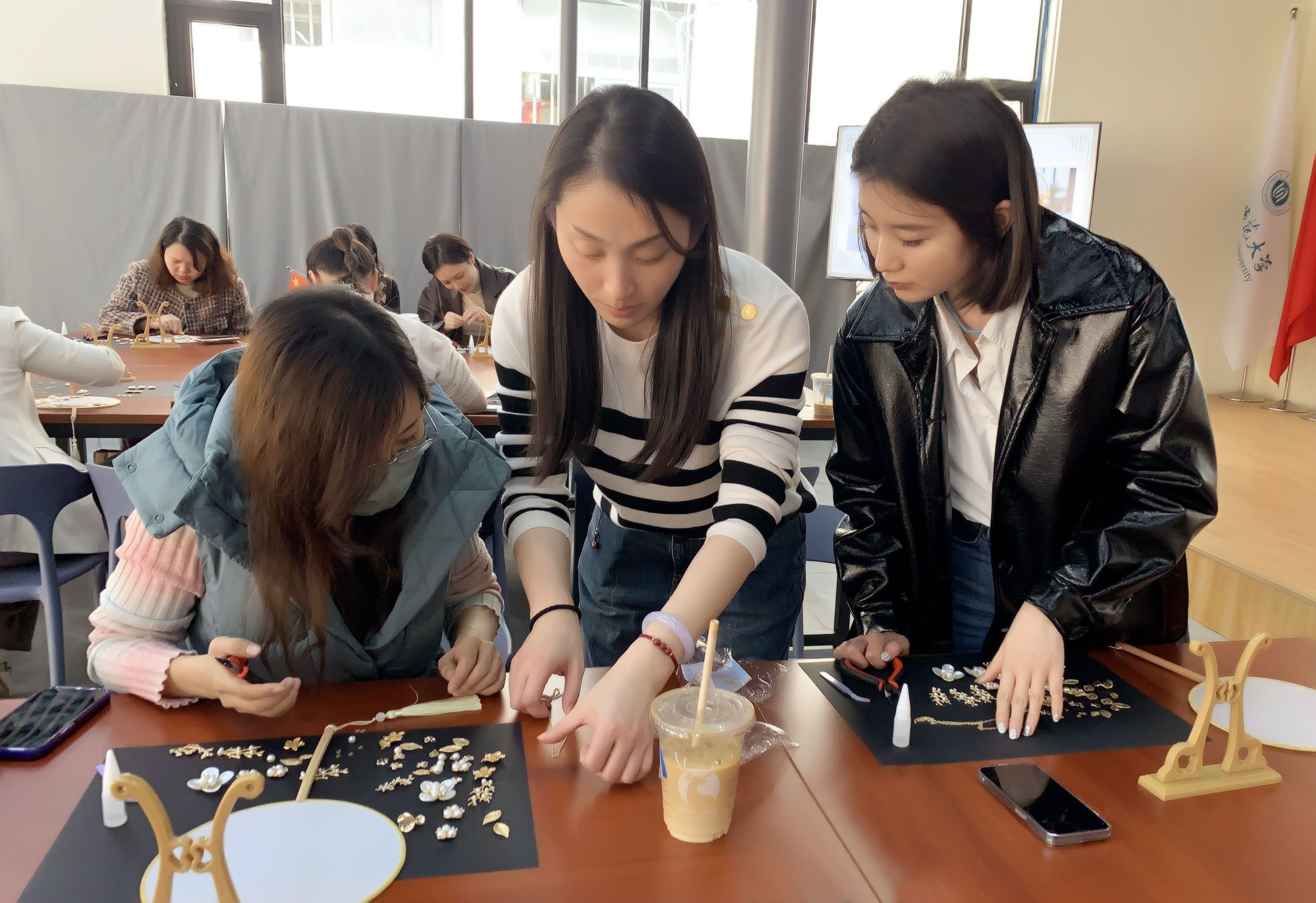 在手作老師的幫助下,大家選取自己喜歡的飾品,充分發(fā)揮個人創(chuàng)造力,在空白扇面上構(gòu)圖搭配,粘貼制作。通過巧手和想象,一柄柄或清新淡雅,或光彩閃耀的團(tuán)扇漸漸展現(xiàn),大家一邊交流制作心得,一邊互相欣賞著這些獨(dú)一無二的團(tuán)扇,現(xiàn)場一片歡聲笑語。制作完成后,老師們手持團(tuán)扇合影留念,盡顯知性之美。