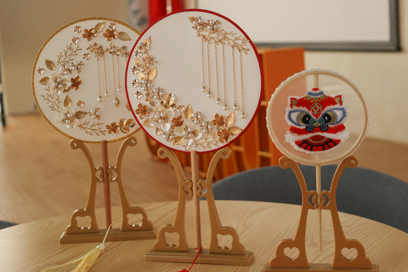 活動開始后,手作老師為大家介紹了團(tuán)扇的歷史背景和制作方法,帶大家欣賞了古色古香的成品團(tuán)扇。大家很快便迫不及待地拿起桌上的材料,開始動手制作。