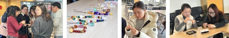 DIY創(chuàng)作環(huán)節(jié),參加活動的老師們興致盎然,挑選彩線與珠飾等材料,將所學(xué)編織技巧融入創(chuàng)意構(gòu)思,在一步步嘗試、摸索中開啟專屬的手機鏈創(chuàng)作之旅。編織過程中,老師們相互交流心得、切磋技藝,分享手工創(chuàng)作的樂趣與喜悅,體驗中華傳統(tǒng)文化之美。活動現(xiàn)場洋溢著歡樂祥和、熱烈溫馨的濃厚氛圍。經(jīng)過一個多小時的精心制作,一條條風(fēng)格各異、獨具創(chuàng)意的手機鏈相繼完成。